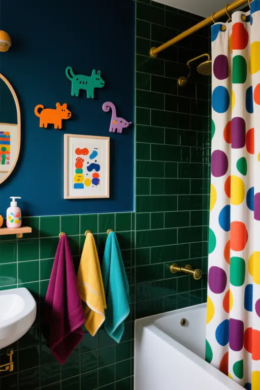 Dark greens, deep blues, and warm plums are all the rage. But here’s the trick: balance those intense hues with fun, kid-friendly accessories—think colorful towels, quirky soap dispensers, and playful art prints.